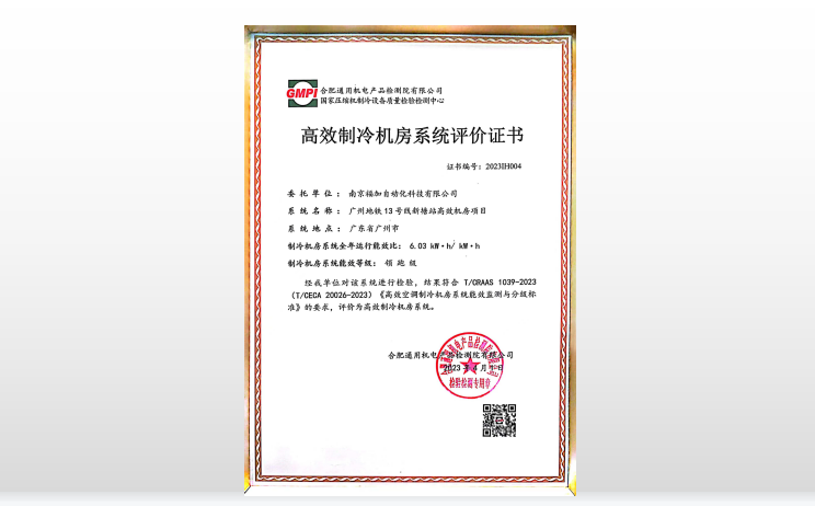 福加實施的廣州地鐵13號線新塘站高效機房系統(tǒng)(年均運行能效6.03)經合肥通用機電產品檢測院有限公司檢驗,結果符合 《高效空調制冷機房系統(tǒng)能效檢測與分級標準》 的要求,評價為高效制冷機房系統(tǒng)。